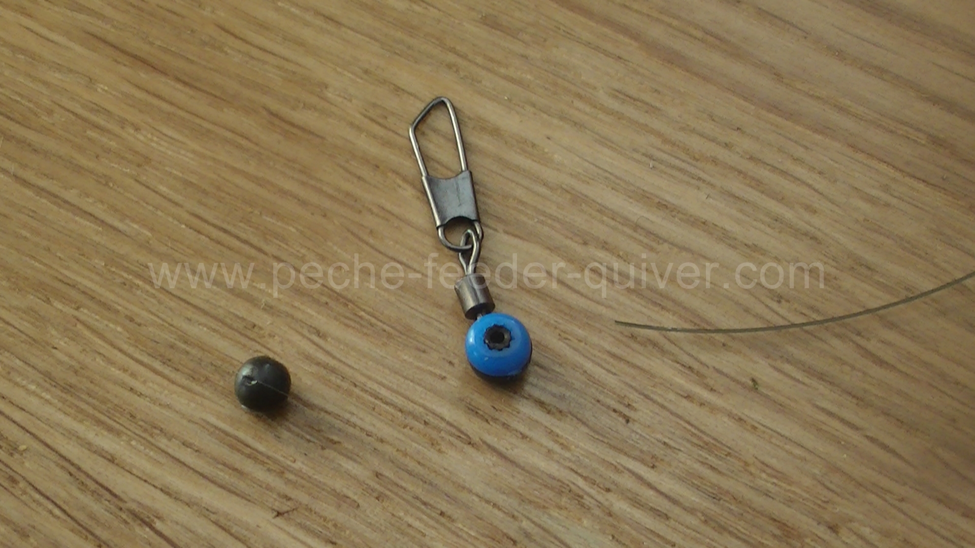 - La perle quick change bead, elle permet le raccordement par boucle mais ne permet pas d’obtenir directement un montage auto-ferrant mais un coulissant, l’ajout d’un stop float sur le corps de ligne au dessus du méthod feeder peut garantir l’auto-ferrage si on le désir.