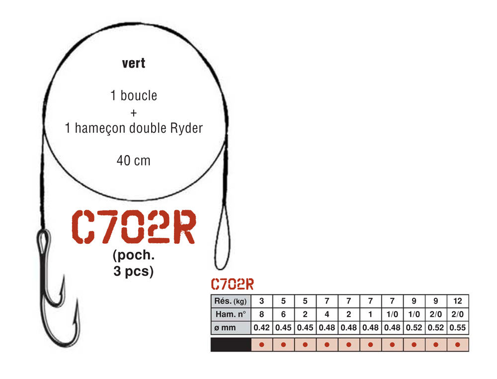 Modèle 1 boucle + 1 hameçon double Ryder, 7 brins inox gainé nylon vert.