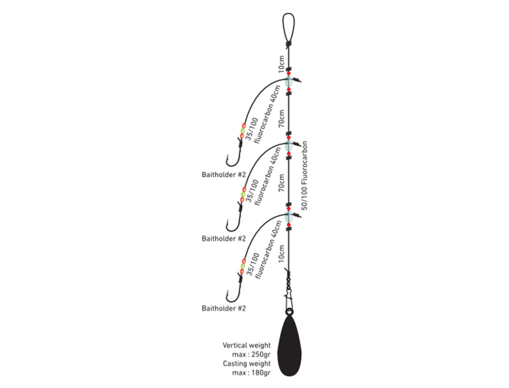 5.10 € Montage réalisé en fluorocarbone avec 3 empiles comportant des hameçons Baitholder en taille n°2.