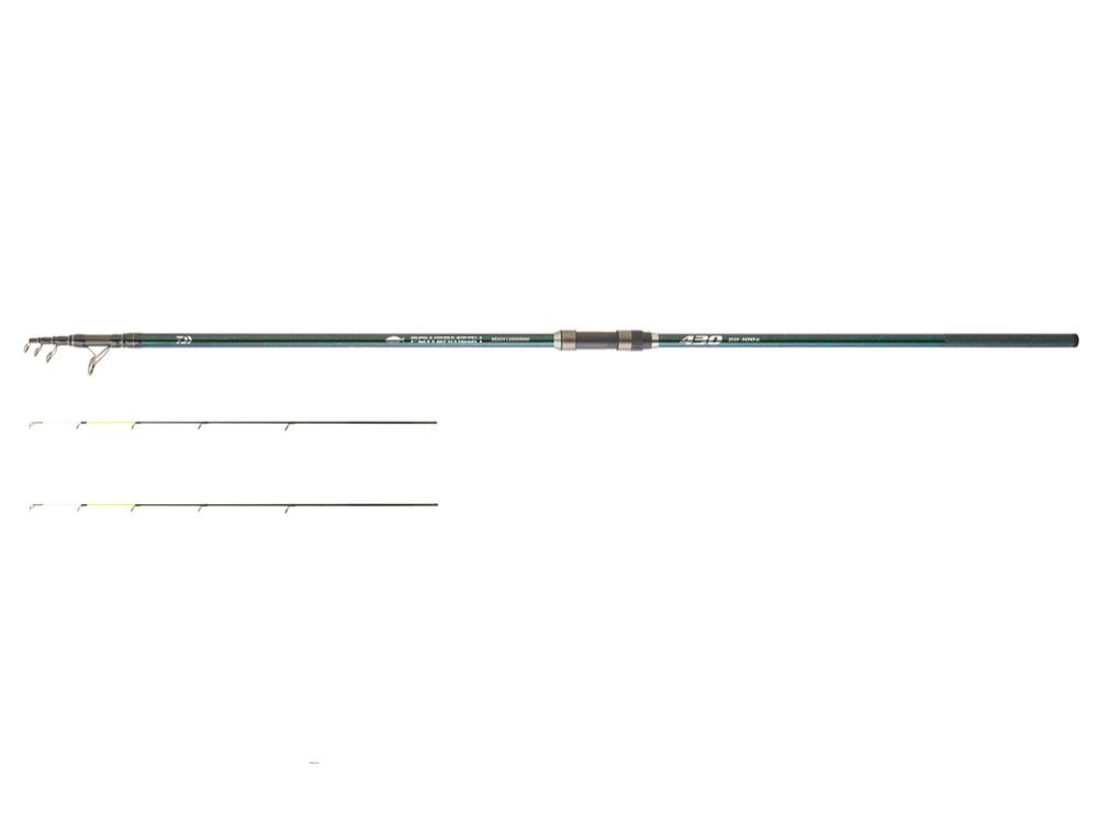 Canne télescopique en carbone de 4,30 m équipée de deux scions interchangeables afin de s'adapter aux différentes conditions de pêche rencontrées.