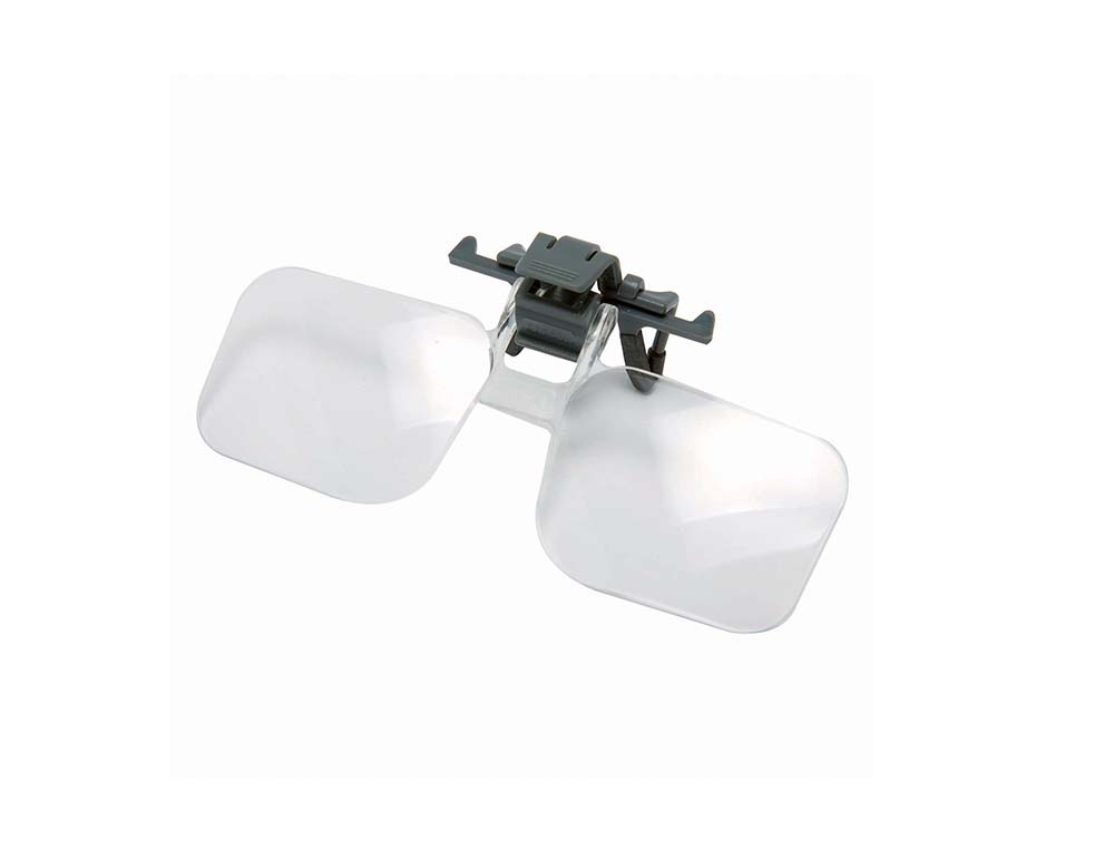 Loupe montée sur une armature relevable, qui se fixe sur tous les types de lunettes.