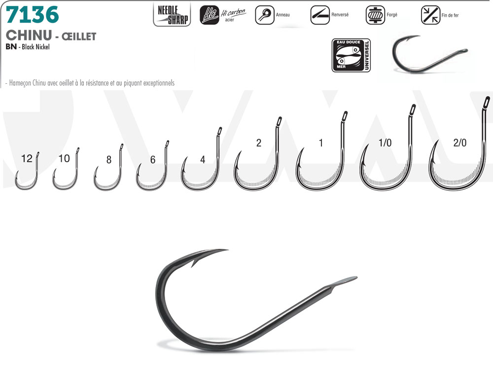 Hameçon VMC 7136 BN Chinu à oeillet taille 1/0