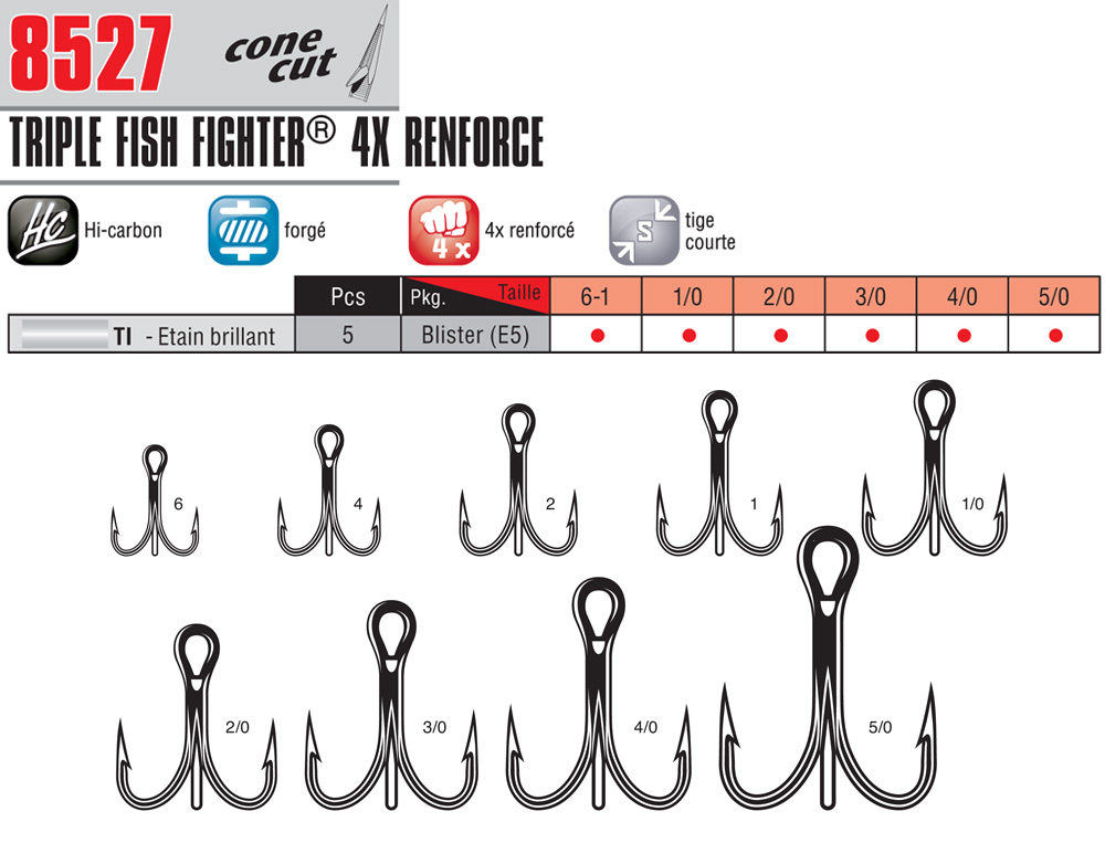 Hameçon 8527 TI (Etain brillant) Triple Fish Fighter 4X Renforcé, forgé, tige courte.