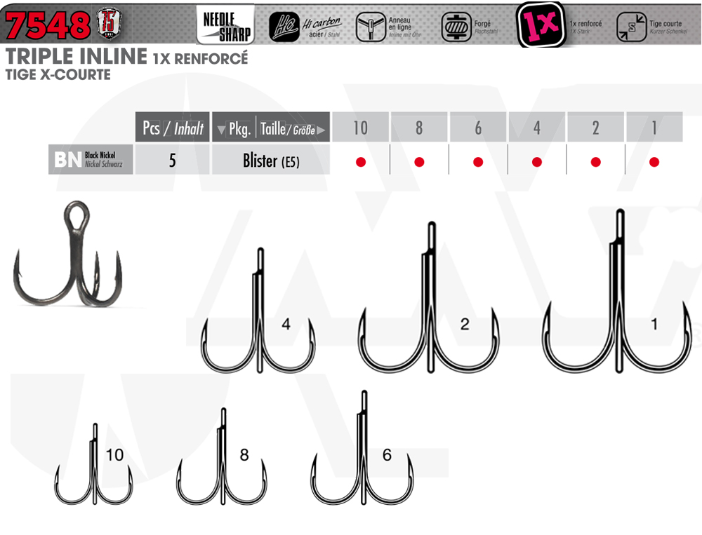 Hameçons VMC 7548 BN Triple Inline 1X renforcé tige X-courte n°1