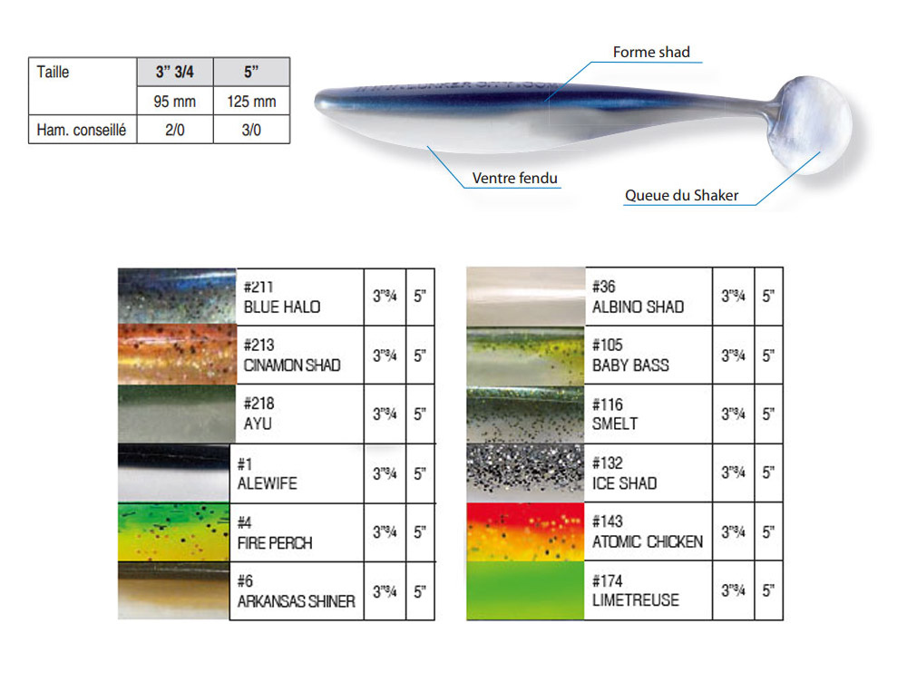 Le Swim Fish est un leurre souple avec un corps de shad et une queue de SHAKER large et souple qui s'anime à la moindre sollicitation.