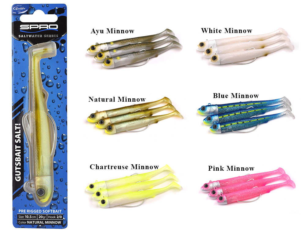 Développé dans la série spéciale "Saltwater Series" de Spro, le Gutsbait Salt ! est un leurre souple prêt à l'emploi, conçu en interne, pour la pêche en mer des carnassiers. Le Gutsbait Salt ! est un leurre monté avec un hameçon texan qui possède un design super profilé, permettant de lancer à grande distance et de nager de façon stable et régulière dans les courants et marées les plus forts. Fabriqué dans un matériau souple mais très résistant, qui dure poisson après poisson. Armé et équipé d'un hameçon Gamakatsu Saltwater offset extra fort, ce leurre est prêt pour affronter les plus beaux spécimens. Disponible en 3 grammages et 6 coloris attrayants.