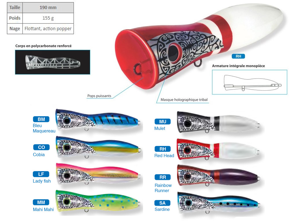 Grâce au renflement en queue ainsi qu’une parfaite répartition du poids, ce popper atteint des distances de lancer impressionnantes même avec les lignes les plus fortes (80/100 lb et plus !).