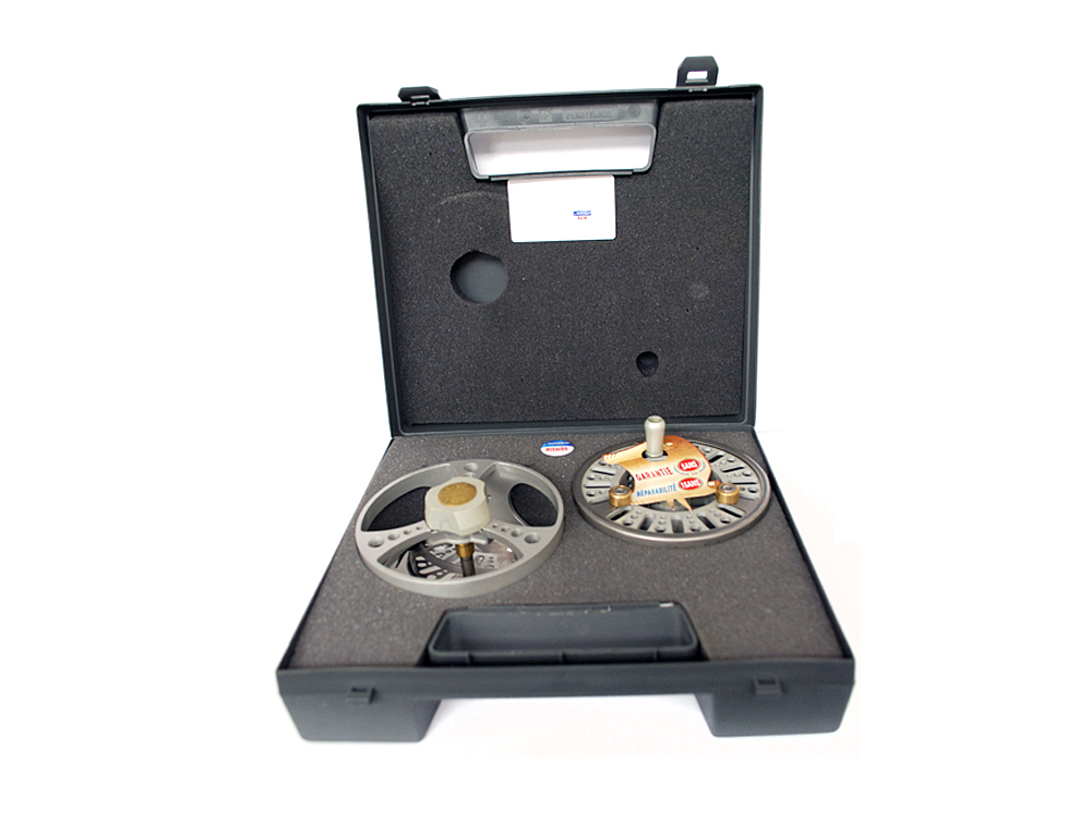 La bobine, de 65mm de diamètre pour le noyau et de 95mm pour le diamètre exterieur, se freine avec la paume de la main grâce au flasque placé sur la bobine. Ses deux contre poids assurent un équilibrage parfait lors du rembobinage de la soie.