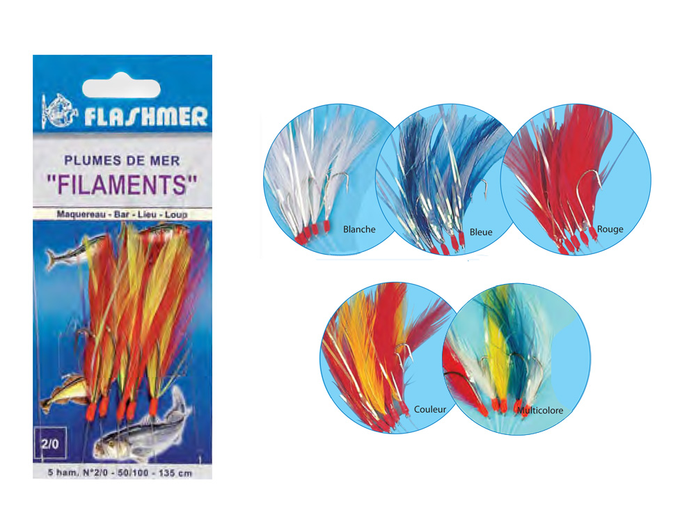 à partir de 4.50 € Plumes de mer montées sur bas de ligne 50/100 longueur 1,35 mètres équipé de 5 hameçons n°2/0.