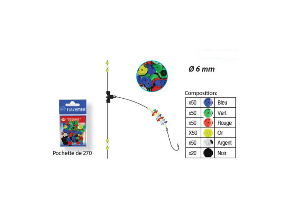 Pochette de 270 sequins, de diamètre 6mm, composé de 6 couleurs : bleu, vert, rouge, or, argent, noir.