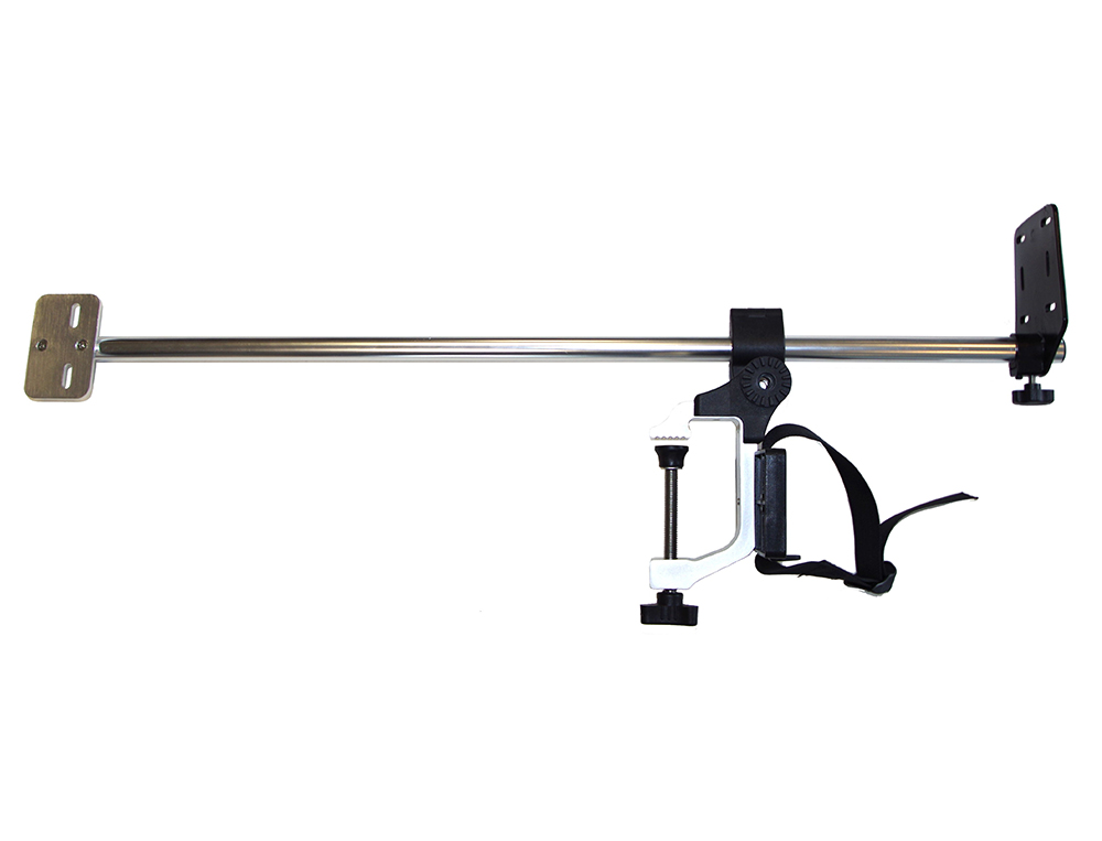 L'ensemble est en aluminium, d'une longueur totale de 80cm, avec un point de serrage type serre-joint