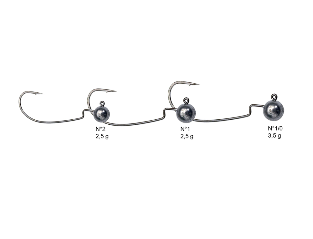 Tête plombée ronde, hameçon texan, spécial pêche et leurre souple de forme fine.