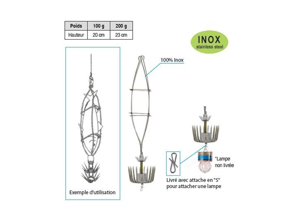 à partir de 8.95 € Turlutte Cage Plombée disponible soit en 100g (hauteur 20cm) soit en 200g (hauteur 23cm) en inox.