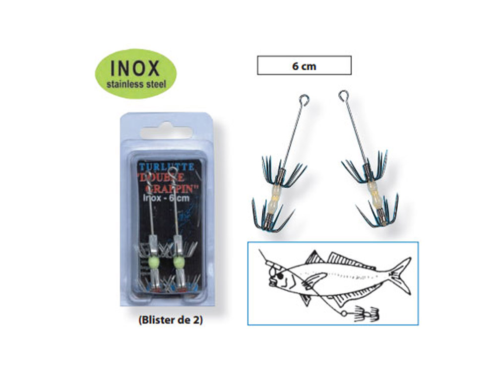 Le "Double grappin" permet de transformer une cuiller "Flashmer" ou un poisson nageur en un redoutable leurre à Sépion, Encornet, Seiche, Calamar...